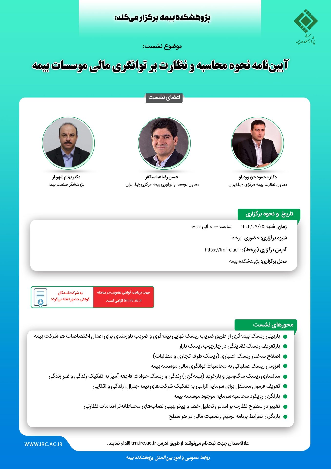 نشست آموزشی با عنوان «آیین نامه نحوه محاسبه و نظارت بر توانگری مالی موسسات بیمه» از ساعت 8:00 تا 10:00 روز شنبه 5 مهرماه 1404 به صورت حضوری و برخط در پژوهشکده بیمه برگزار میشود.