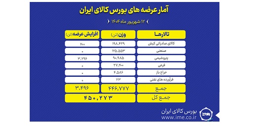 تالارهای بورس کالای ایران امروز چهارشنبه ۱۲ شهریور ماه میزبان عرضه ۴۵۰ هزار و ۲۷۳ تن انواع محصول است. بیشترین عرضه امروز در تالار صادراتی رقم می خورد.