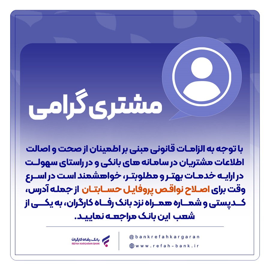 مشتریان بانک رفاه کارگران که اطلاعات پروفایل حساب آنان نزد این بانک ناقص است، نسبت به اصلاح یا تکمیل این اطلاعات اقدام کنند.