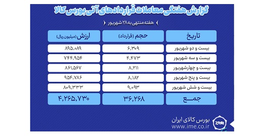 بررسی روند معاملات قراردادهای آتی بورس کالای ایران درهفته منتهی به ۲۸ شهریور نشان می دهد که در هفته گذشته ارزش معاملات بازار آتی به بیش از ۴۲۶ میلیارد تومان رسید.