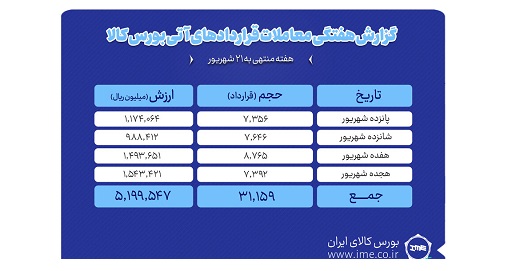 بررسی روند معاملات قراردادهای آتی بورس کالای ایران درهفته منتهی به ۲۱ شهریور نشان می دهد که در هفته گذشته ارزش معاملات بازار آتی به بیش از ۵۲۰ میلیارد تومان رسید.