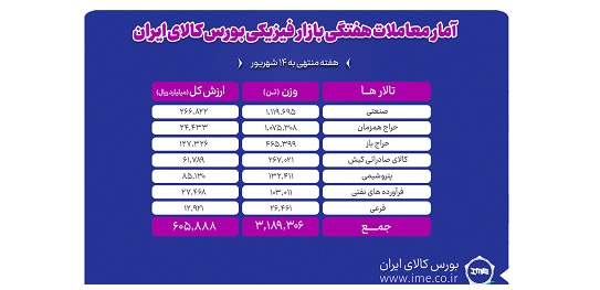 در معاملات هفته گذشته بازار فیزیکی بورس کالای ایران ۳ میلیون و ۱۸۹ هزار و ۳۰۶ تن انواع محصول به ارزش ۶۰.۶ هزار میلیارد تومان دادوستد شد.