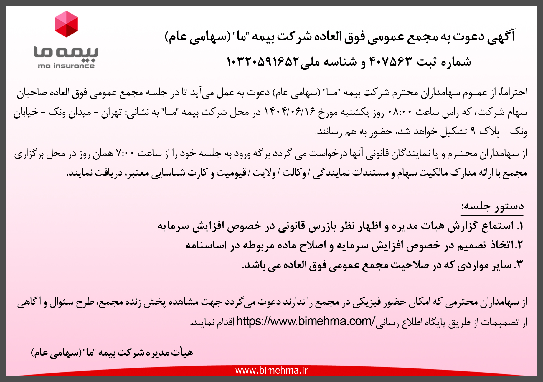 دعوت از سهامداران بیمه “ما “برای مجمع عمومی فوق العاده