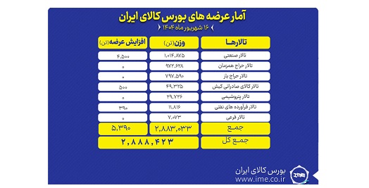 تالارهای بورس کالای ایران روز یکشنبه ۱۶ شهریور ماه میزبان عرضه ۲ میلیون و ۸۸۸ هزار و ۴۲۳ تن انواع محصول است و به ترتیب تالار صنعتی، حراج همزمان و حراج باز بیشترین میزان عرضه ها را به خود اختصاص داده اند.