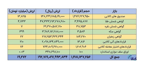 در معاملات امروز بازارهای مالی و مشتقه بورس کالای ایران، ارزش معاملات روزانه این بازارها یک رکورد تاریخی جدید را به ثبت رساند و به بیش از ۱۹.۲ همت رسید.