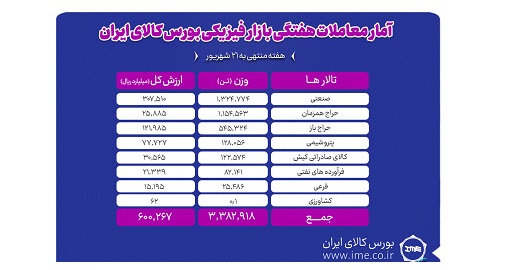 در معاملات هفته گذشته بازار فیزیکی بورس کالای ایران ۳ میلیون و ۳۸۲ هزار و ۹۱۸ تن انواع محصول به ارزش ۶۰ هزار میلیارد تومان دادوستد شد.