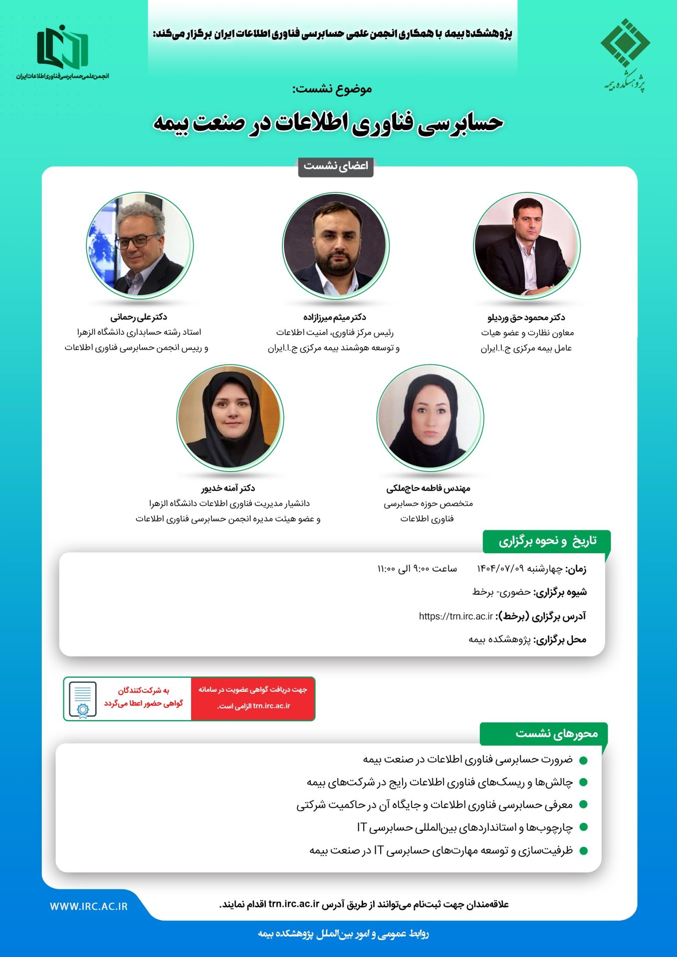 به گزارش فراسو به نقل از روابط عمومی پژوهشکده بیمه، در این نشست آموزشی محورهای «ضرورت حسابرسی فناوری اطلاعات در صنعت بیمه»، «چالش‌ها و ریسک‌های فناوری اطلاعات رایج در شرکت‌های بیمه»، «معرفی حسابرسی فناوری اطلاعات و جایگاه آن در حاکمیت شرکتی»، «چارچوب‌ها و استانداردهای بین‌المللی حسابرسی IT» و «ظرفیت‌سازی و توسعه مهارت‌های حسابرسی IT در صنعت بیمه» توسط آقایان «دکتر محمود حق وردیلو، معاون نظارت و عضو هیات عامل بیمه مرکزی ج.ا.ایران»، «دکتر میثم میرزازاده، رئیس مرکز فناوری، امنیت اطلاعات و توسعه هوشمند بیمه مرکزی ج.ا.ایران»، «دکتر علی رحمانی، استاد رشته حسابداری دانشگاه الزهرا و رییس انجمن حسابرسی فناوری اطلاعات»، و خانم‌ها «مهندس فاطمه حاج‏ ملکی، متخصص حوزه حسابرسی فناوری اطلاعات» و «دکتر آمنه خدیور، دانشیار مدیریت فناوری اطلاعات دانشگاه الزهرا و عضو هیئت مدیره انجمن حسابرسی فناوری اطلاعات» ارائه خواهد شد.