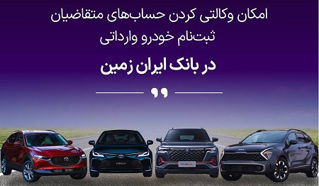 امکان معرفی حساب وکالتی برای ثبت نام خودروهای وارداتی در بانک ایران زمین فراهم است.