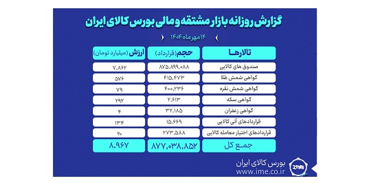 همچنین در معاملات روز۱۴مهر ماه بازار مشتقه و مالی، ۸۷۵ میلیون و ۸۹۹ هزار و ۸۸ واحد صندوق کالایی به ارزش ۷ هزار و ۸۶۲ میلیارد تومان دست به دست شد.