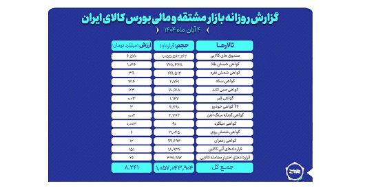 روز گذشته در بازار مشتقه و مالی بورس کالای ایران یک میلیارد و ۵۷ میلیون و ۴۳ هزار و ۹۰۴ قرارداد به ارزش ۸ هزار و ۲۴۱ میلیارد تومان منعقد شد.