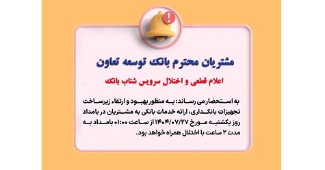 اعلام قطعی موقت سرویس شتاب بانک توسعه تعاون