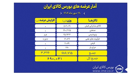 تالارهای بورس کالای ایران امروز دوشنبه ۲۸ مهر ماه میزبان عرضه ۶۹۰ هزار و ۴۱ تن انواع محصول است. بیشترین عرضه امروز متعلق به تالار صادراتی کیش و بعد از آن تالار صنعتی است.