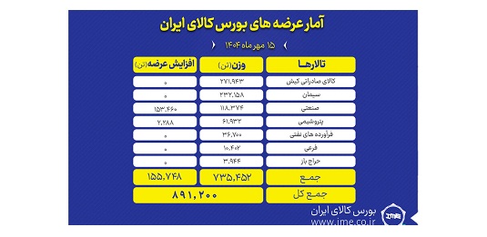 تالارهای بورس کالای ایران امروز سه شنبه ۱۵ مهر ماه میزبان عرضه ۸۹۱ هزار و ۲۰۰ تن انواع محصول است. بیشترین حجم عرضه امروز از آن تالار صادراتی است.