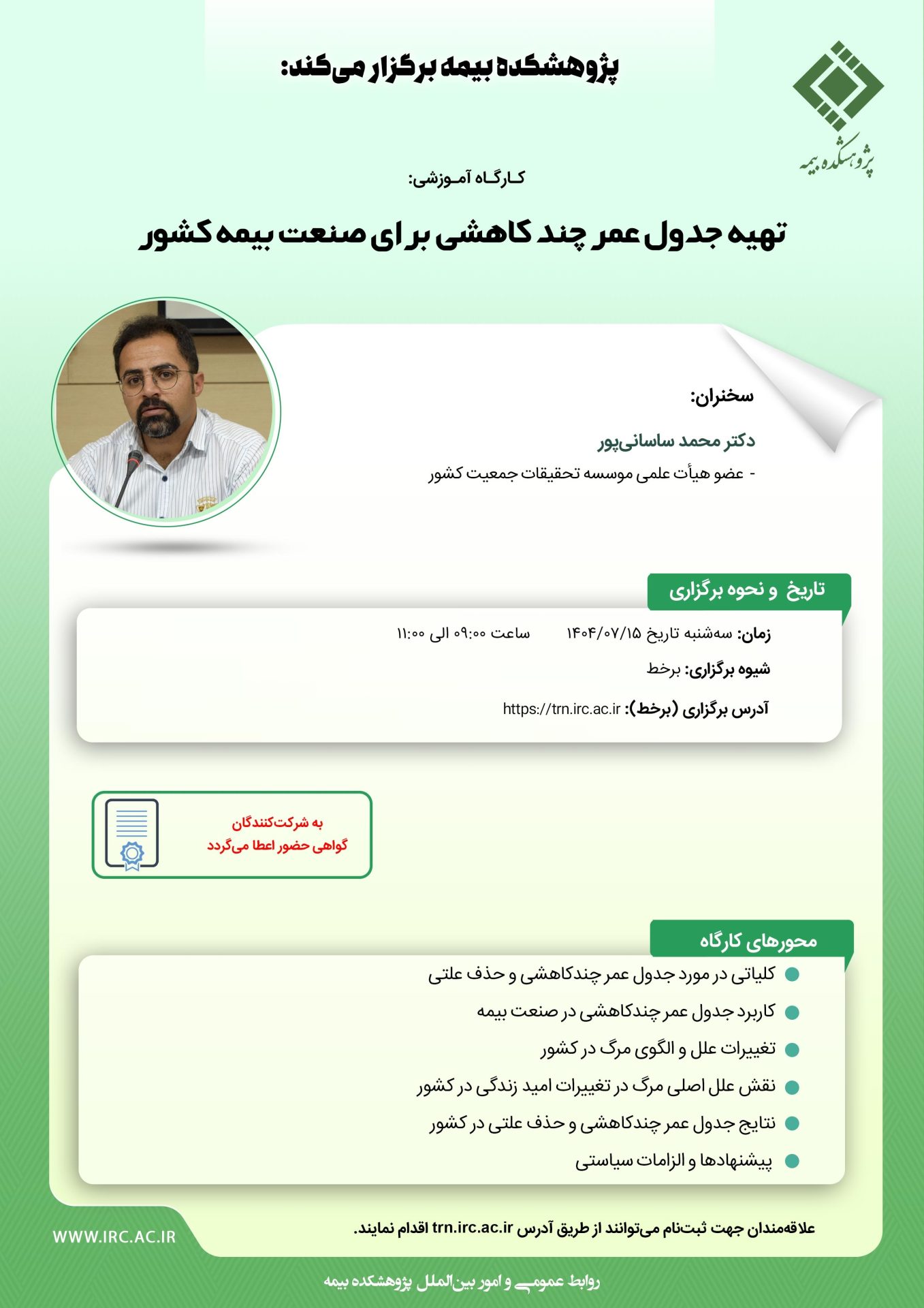 نشست آموزشی با عنوان”تهیه جدول عمر چند کاهشی برای صنعت بیمه کشور” از ساعت 9:00 تا 11:00 روز سهشنبه 15 مهرماه، به صورت برخط در پژوهشکده بیمه برگزار میشود.