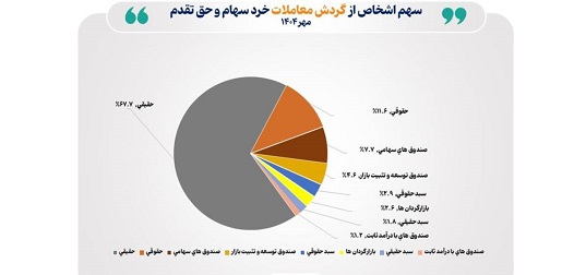 به گزارش فراسو، داده‌های آماری مدیریت نظارت بر بورس‌های سازمان بورس نشان می‌دهد در مهر امسال، سهم حقیقی‌ها، حقوقی‌ها و صندوق‌های سهامی از بازار، به ترتیب ۲،۰۱۰،۱۲۸ میلیارد ریال (۶۷.۷درصد)، ۳۴۴،۹۳۰ میلیارد ریال (۱۱.۶ درصد) و ۲۲۸،۹۸۸ میلیارد ریال (۷.۷ درصد) بود.
