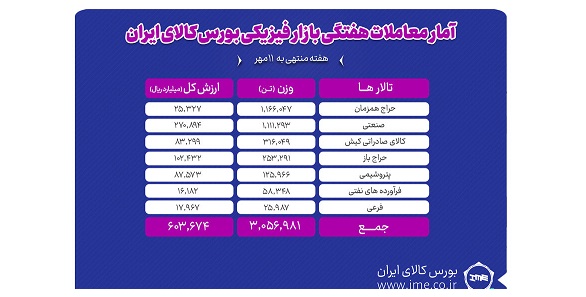 در معاملات هفته گذشته بازار فیزیکی بورس کالای ایران ۳ میلیون و ۵۶ هزار و ۹۸۱ تن انواع محصول به ارزش ۶۰.۴ هزار میلیارد تومان دادوستد شد.