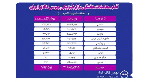 در معاملات هفته گذشته بازار فیزیکی بورس کالای ایران ۳ میلیون و ۸۰۵ هزار و ۵۳۵ تن انواع محصول به ارزش ۷۹.۲ هزار میلیارد تومان دادوستد شد.