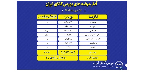 تالارهای بورس کالای ایران امروز یکشنبه ۲۷ مهرماه میزبان عرضه ۲ میلیون و ۵۹۹ هزار و ۹۷۸ تن محصول است.