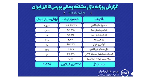 روز گذشته در بازار مشتقه و مالی بورس کالای ایران بالغ بر یک میلیارد و ۱۲۸میلیون قرارداد به ارزش ۹ هزار و ۵۵۱ میلیارد تومان منعقد شد.
