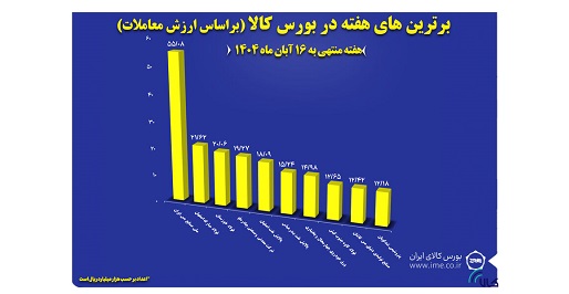 آمار معاملات بازار فیزیکی بورس کالای ایران نشان می دهد در هفته منتهی به ۱۶ آبان ماه بیش از ۲ میلیون و ۶۲۳ هزار تن انواع کالا و محصول به ارزش بالغ بر ۴۸.۷ هزار میلیارد تومان معامله شد. همچنین ارزش معاملات ۱۰ شرکت برتر به بیش از ۲۰.۲ هزار میلیارد تومان رسید.