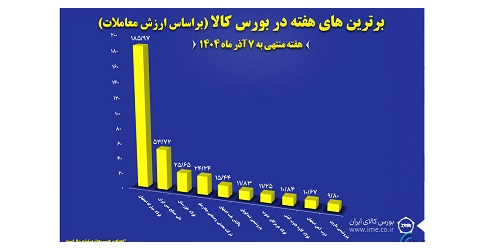 آمار معاملات بازار فیزیکی بورس کالای ایران نشان می دهد در هفته منتهی به ۷ آذر ماه حدود ۳ میلیون و ۹۳ هزار تن انواع کالا و محصول به ارزش بالغ بر ۶۷.۵ هزار میلیارد تومان معامله شد. همچنین ارزش معاملات ۱۰ شرکت برتر به بیش از ۳۵.۹ هزار میلیارد تومان رسید.