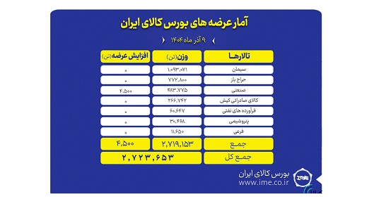 تالارهای بورس کالای ایران امروز یکشنبه ۹ آذرماه میزبان عرضه ۲ میلیون و ۷۲۳ هزار و ۶۵۳ تن انواع محصول است. تالار سیمان بیشترین حجم عرضه امروز را به خود اختصاص داده است.