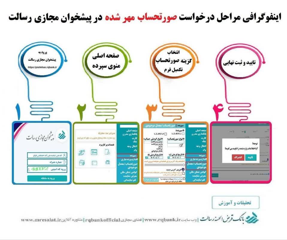 ️بانک قرض الحسنه رسالت در راستای تسهیل امور مشتریان خود مراحل درخواست صورتحساب ممهور و چاپی در پیشخوان مجازی رسالت را اطلاع رسانی کرد.
