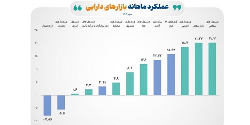 طبق اطلاعات و دادههای مرکز نظارت بر صندوقهای سرمایهگذاری سازمان بورس و اوراق بهادار در مهر ۱۴۰۴، بازده ۸ ابزار سرمایهگذاری بازار سرمایه مثبت بوده است.