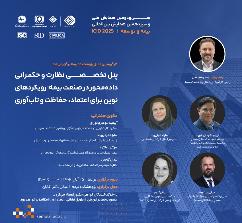 پنل تخصصی کارگروه بین‌الملل پژوهشکده بیمه با عنوان “نظارت و حکمرانی داده‌محور در صنعت بیمه: رویکردهای نوین برای اعتماد، حفاظت و تاب‌آوری”در چارچوب سی‌ودومین همایش ملی و سیزدهمین همایش بین‌المللی بیمه و توسعه، روز یکشنبه ۲5 آبان‌ماه ۱۴۰۴ به‌صورت برخط برگزار می‌شود.
