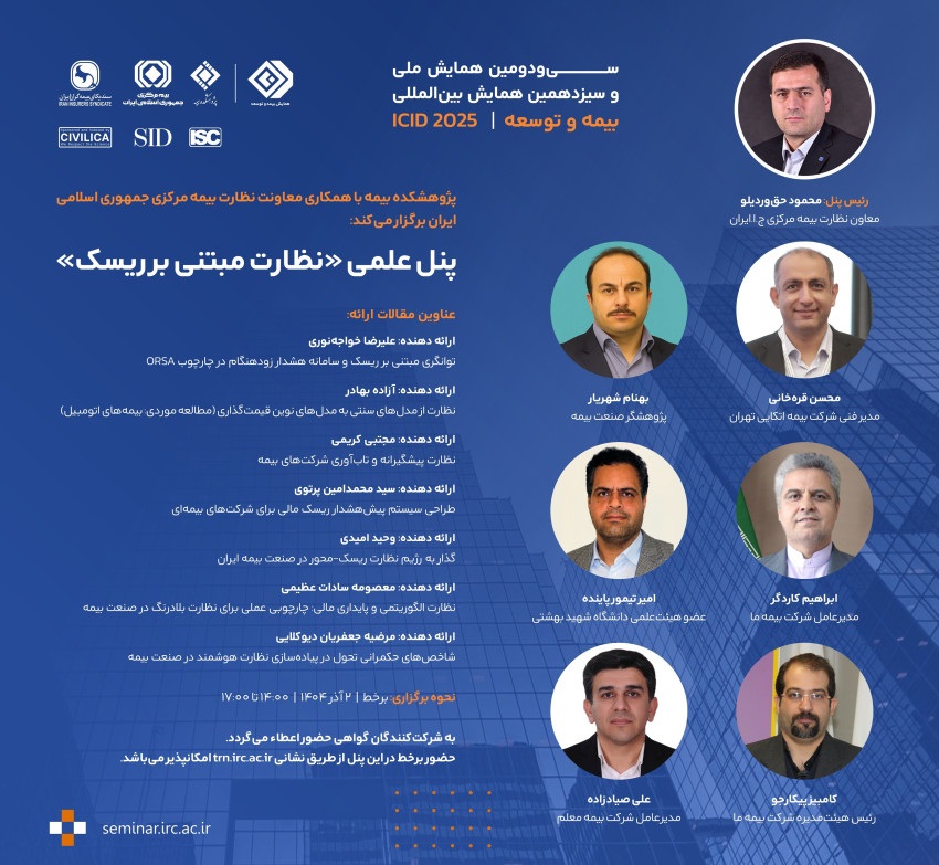 در این پنل علیرضا خواجه نوری، آزاده بهادر، مجتبی کریمی، سید محمد امین پرتوی، وحید امیدی، معصومه سادات عظیمی و مرضیه جعفریان دیوکلایی به ارائه مقاله با عناوین « توانگری مبتنی بر ریسک و سامانه هشدار زودهنگام در چارچوب ORSA»، « نظارت از مدل‌های سنتی به مدل‌های نوین قیمت‌گذاری (مطالعه موردی: بیمه‌های اتومبیل)»، « نظارت پیشگیرانه و تاب‌آوری شرکت‌های بیمه»، و «طراحی سیستم پیش‌هشدار ریسک مالی برای شرکت‌های بیمه‌ای»، «گذار به رژیم نظارت ریسک-‌محور در صنعت بیمه ایران»، «نظارت الگوریتمی و پایداری مالی: چارچوبی عملی برای نظارت بلادرنگ در صنعت بیمه» و « شاخص‌های حکمرانی تحول در پیاده‌سازی نظارت هوشمند در صنعت بیمه» خواهند نمود.