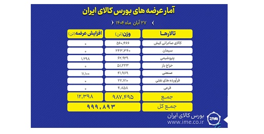 تالارهای بورس کالای ایران امروز سه‌شنبه ۲۷ آبان ماه میزبان عرضه ۹۹۹ هزار و ۸۹۳ تن انواع محصول است.
