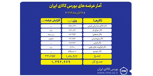 تالارهای بورس کالای ایران امروز چهارشنبه ۲۸ آبان ماه میزبان عرضه یک میلیون و ۲۹۲ هزار و ۶۶۹ تن انواع محصول است.