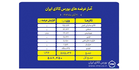 تالارهای بورس کالای ایران امروز چهارشنبه ۲۱ آبان ماه میزبان عرضه ۵۸۶ هزار و ۴۵۰ تن انواع محصول است.