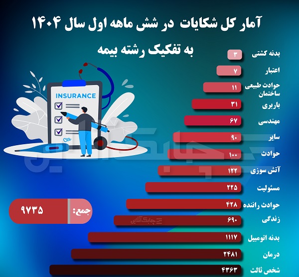 از میان شکایات ثبت‌شده،بیمه شخص ثالث بیشترین سهم را به خود اختصاص داده و با ۴۳۶۳ مورد شکایت، حدود ۴۴٫۸ درصد از کل شکایات را تشکیل می‌دهد.