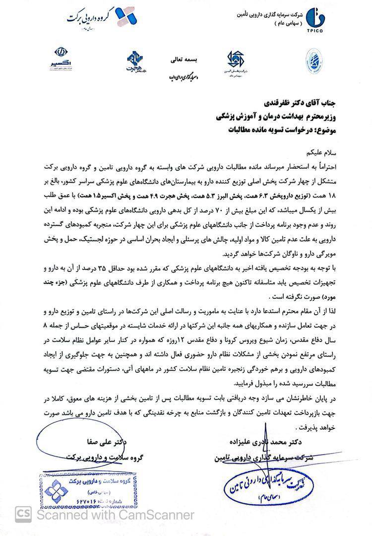 مدیران عامل تیپیکو و برکت به عنوان دو هلدینگ بزرگ دارویی کشور در نامه‌ای مشترک از وزیر بهداشت خواستار تسویه فوری مانده مطالبات دارویی شدند.