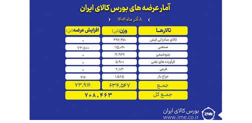 تالارهای بورس کالای ایران امروز شنبه ۸ آذرماه میزبان عرضه ۷۰۸ هزار و ۴۶۳ تن انواع محصول است.تالار صادراتی بیشترین حجم عرضه های امروز را به خود اختصاص داده است.