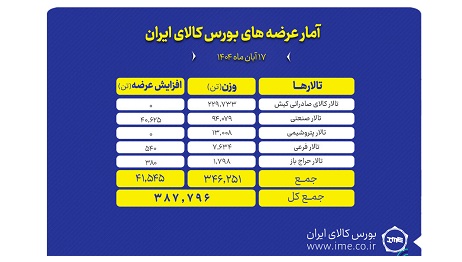 تالارهای بورس کالای ایران در اولین روز هفته (شنبه ۱۷ آبان ماه) میزبان عرضه ۳۸۷ هزار و ۷۹۶ تن انواع محصول است. بیشترین حجم عرضه امروز متعلق به تالار صادراتی کیش است به طوری که در این تالار بیش از ۲۲۹ هزار تن محصول روی تابلو می رود.