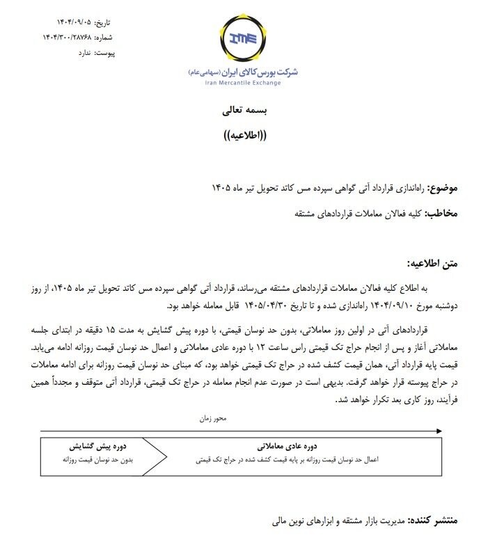 قرارداد آتی گواهی سپرده مس کاتد تحویل تیرماه ۱۴۰۵ از روز دوشنبه ۱۰ آذرماه راه اندازی شده و تا تاریخ ۳۰ تیرماه قابل معامله خواهد بود.