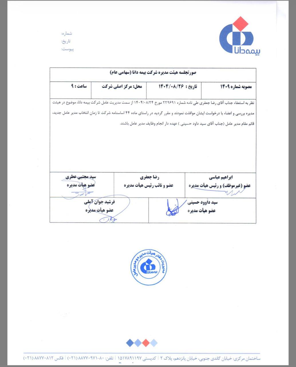 به دنبال استعفای دکتر رضا جعفر از مدیرعاملی بیمه دانا و پذیرش استعفای وی از سوی هیأتمدیره این شرکت، دکتر سید داوود حسینی قائم مقام مدیرعامل به عنوان سرپرست بیمه دانا منصوب شد.