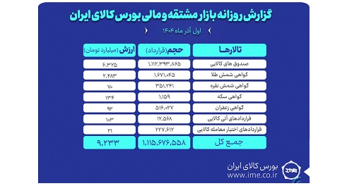 روز گذشته در بازار مشتقه و مالی بورس کالای ایران بالغ بر یک میلیارد و ۱۱۵ میلیون قرارداد به ارزش ۹ هزار و ۲۳۳ میلیارد تومان منعقد شد.