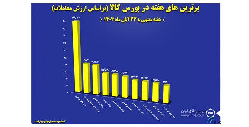 آمار معاملات بازار فیزیکی بورس کالای ایران نشان می دهد در هفته منتهی به ۲۳ آبان ماه حدود ۲ میلیون و ۶۸۳ هزار تن انواع کالا و محصول به ارزش بالغ بر ۴۷.۹ هزار میلیارد تومان معامله شد. همچنین ارزش معاملات ۱۰ شرکت برتر به بیش از ۱۸.۷ هزار میلیارد تومان رسید.