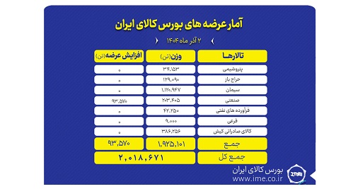 تالارهای بورس کالای ایران امروز یکشنبه دوم آذرماه میزبان عرضه ۲ میلیون و ۱۸ هزار و ۶۷۱ تن انواع محصول است.تالار سیمان بیشترین حجم عرضه امروز را به خود اختصاص داده است.