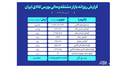روز گذشته در بازار مشتقه و مالی بورس کالای ایران بالغ بر ۲ میلیارد و ۷۹۵ میلیون قرارداد به ارزش ۱۸هزار و ۴۶۳ میلیارد تومان منعقد شد.