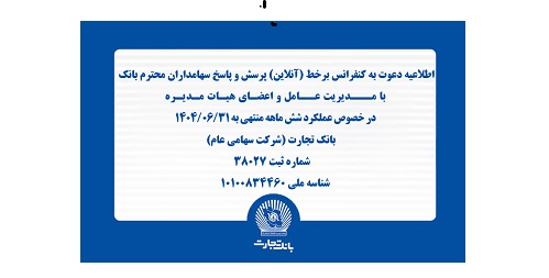 اطلاعیه دعوت به کنفرانس برخط (آنلاین) پرسش و پاسخ سهامداران محترم بانک با مدیریت‌عامل و اعضای هیات‌مدیره، در خصوص عملکرد شش ماهه منتهی به 1404/06/31 بانک تجارت (شرکت سهامی عام) شماره ثبت38027 شناسه ملی 10100834460