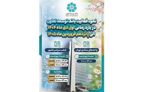 ساعات کاری واحدهای ستادی بانک توسعه تعاون در تهران نیز از شنبه تا چهارشنبه از ساعت ۰۷:۰۰ تا ۱۴:۰۰ خواهد بود.