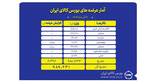 تالارهای بورس کالای ایران امروز سهشنبه ۱۱ آذر ماه میزبان عرضه ۹۸۹ هزار و ۲۳۱ تن انواع محصول است.
