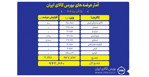 تالارهای بورس کالای ایران امروز سهشنبه ۲۵ آذرماه میزبان عرضه ۹۴۲ هزار و ۶۶۰ تن انواع محصول است.