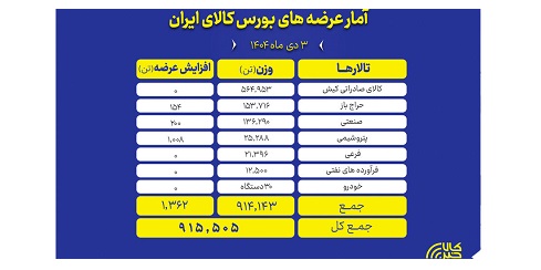 تالارهای بورس کالای ایران امروز چهارشنبه ۳ دی ماه میزبان عرضه ۹۱۵ هزار و ۵۰۵ تن انواع محصول است.