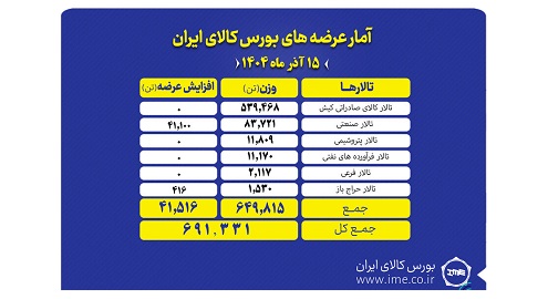 تالارهای بورس کالای ایران امروز شنبه ۱۵ آذرماه میزبان عرضه ۶۹۱ هزار و ۳۳۱ تن انواع محصول است.