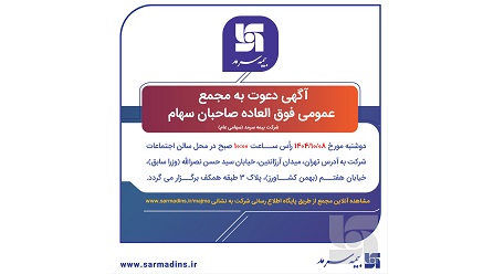 بدینوسیله به اطلاع کلیه سهامداران محترم شرکت بیمه سرمد (سهامی عام) می رساند، باعنایت به مجوز شماره 149-1413453/044 مورخ 1404/09/23 سازمان بورس و اوراق بهادار تهران، جلسه مجمع عمومی فوق العاده این شرکت در روز دوشنبه مورخ 1404/10/08 رأس ساعت 10:00 صبح در محل سالن اجتماعات شرکت به آدرس تهران، میدان آرژانتین، خيابان سید حسن نصرالله (وزرا سابق)، خيابان هفتم (بهمن کشاورز)، پلاک 3 طبقه همکف برگزار می گردد.